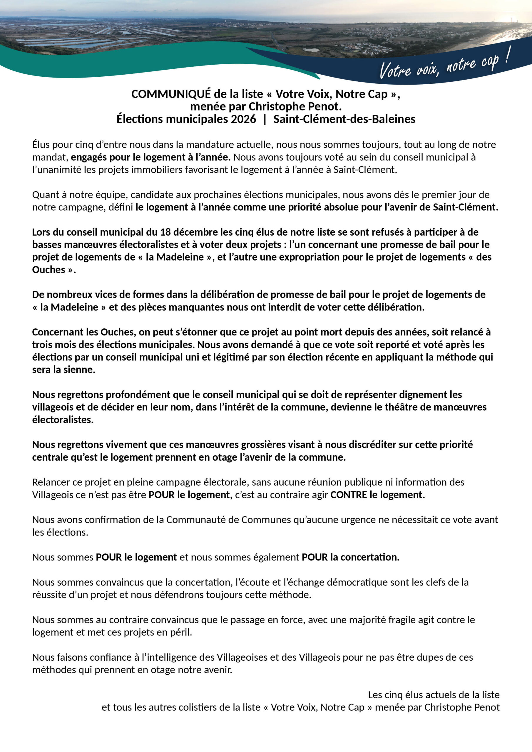 🔸Aujourd’hui, avec mon épouse, nous avons décidé de nous investir pour la vie locale du village de Saint Clément des Baleines qui nous est cher. C’est pourquoi j’ai souhaité rejoindre la liste de Christophe PENOT. L’ensemble de l’équipe affiche des valeurs que je partage, telles que l’écoute, le respect de chacun, le vivre ensemble, tout en considérant la parole des habitants, qu’ils soient résidents à temps pleins ou secondaires. Ce positionnement me semble essentiel pour nous mettre au service du bien commun, en cohérence et transparence. Mon engagement, dans ce contexte, est pour moi une façon d’apporter mon humble contribution à l’équipe et aux villageois.